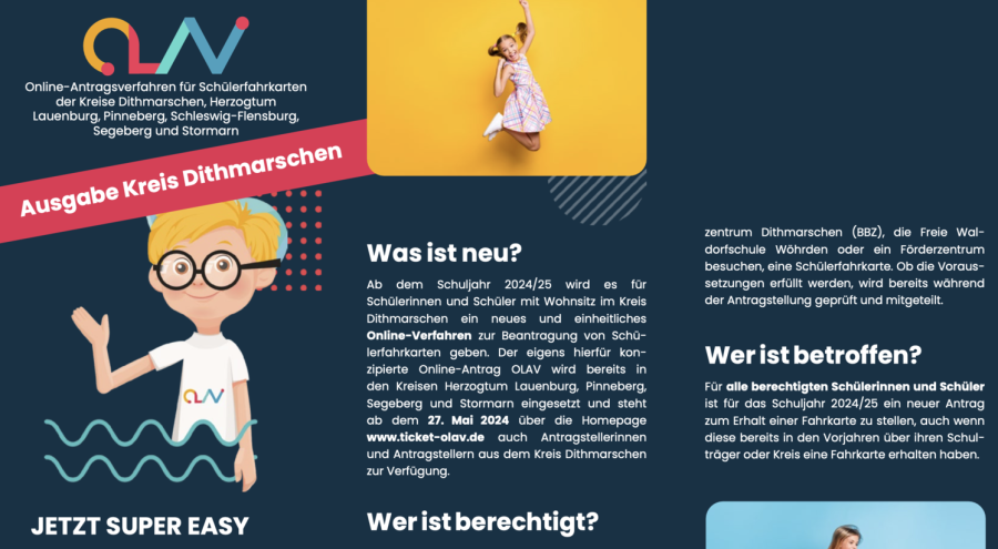 In Dithmarschen hat jede Schülerin und jeder Schüler das Anrecht auf das Deutschlandticket - egal wie weit der Schulweg ist. Dies muss bei "OLAV" beantragt werden. Der Antrag wird von der Schule Ihres Kindes bestätigt und anschließend erhält Ihr Kind eine Karte in der Schule, die es besucht.